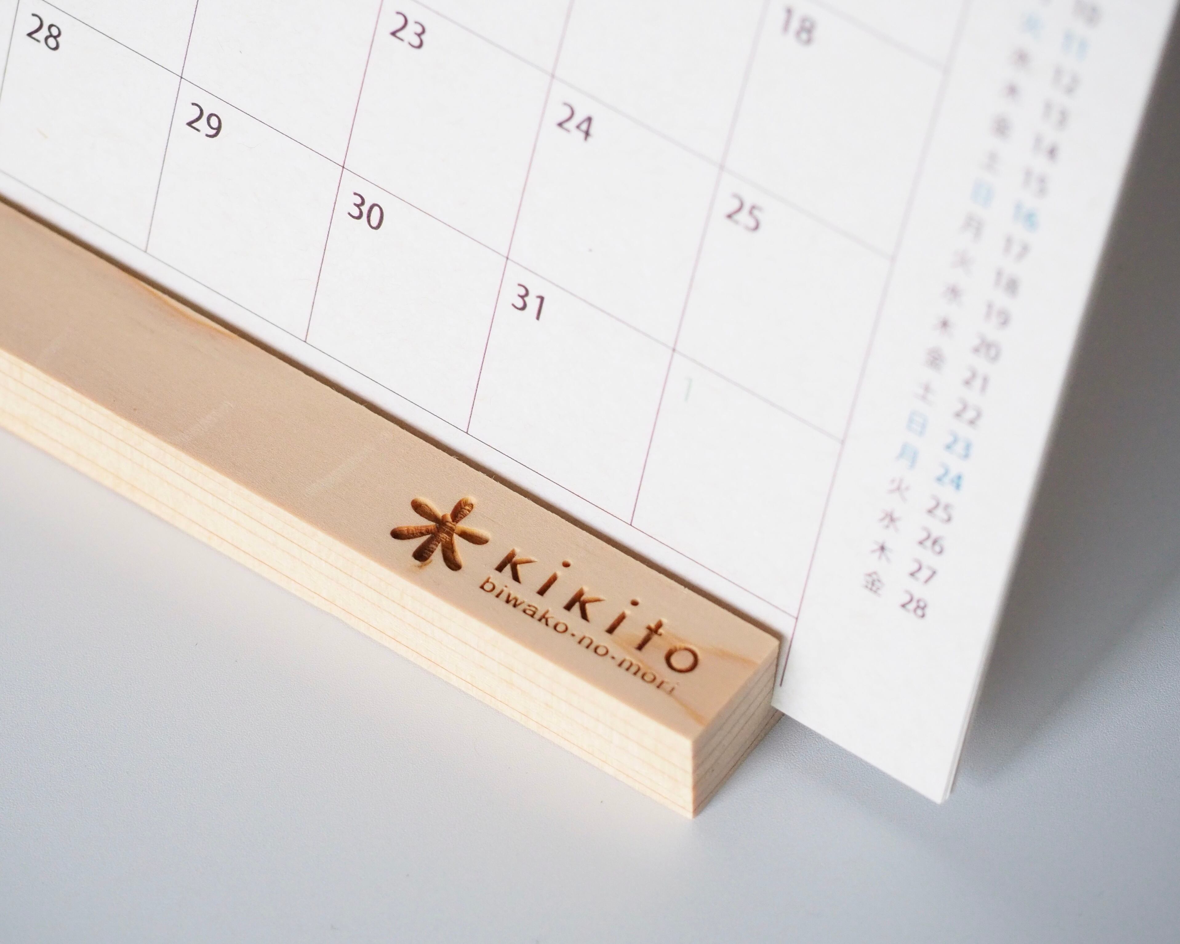 kikitoのロゴをさりげなくレーザーで刻印した、シンプルなデザインで使いやすい卓上カレンダーです。